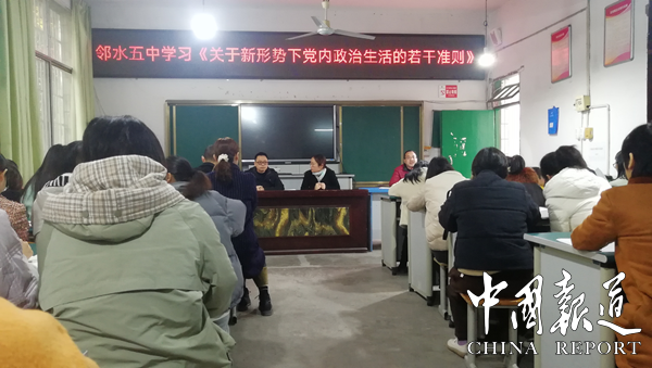 中国报道讯(通讯员 王小丽)12月8日,邻水五中组织党员及全体教职工学习《关于新形势下党内政治生活的若干准则》。