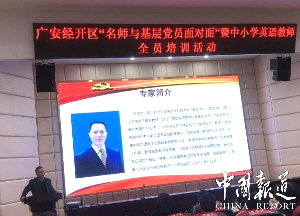 中国报道讯(通讯员 李华 黄胜)百年大计,教育为本。教师是立教之本、兴教之源。为提升全区中小学英语教师的口语素养和教学能力,进一步增强立德树人、教书育人的荣誉感和责任感,12月15日,由广安经开区社会事务局主办、经开区教师发展中心和贺宗林名师工作室承办的广安经开区“名师与基层党员面对面”暨中小学英语教师全员培训活动,在广安经开区第一小学如期举行,全区中小学英语党员教师、骨干教师共140余人参加培训活动。活动包含“名师与基层党员面对面”活动和美式英语口语培训两个阶段。
