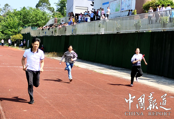 运动会现场气氛热烈,学生们自发组织的啦啦队为参赛队伍加油助威,口号和助威歌曲响彻云霄,激发了在场每个人的热情。教师们也在师生接力赛中展现出良好的互动。